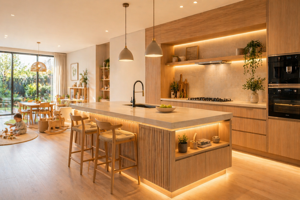 Muebles en melamina RH para cocinas, baños y oficinas, resistentes a la humedad y diseñados para uso intensivo.